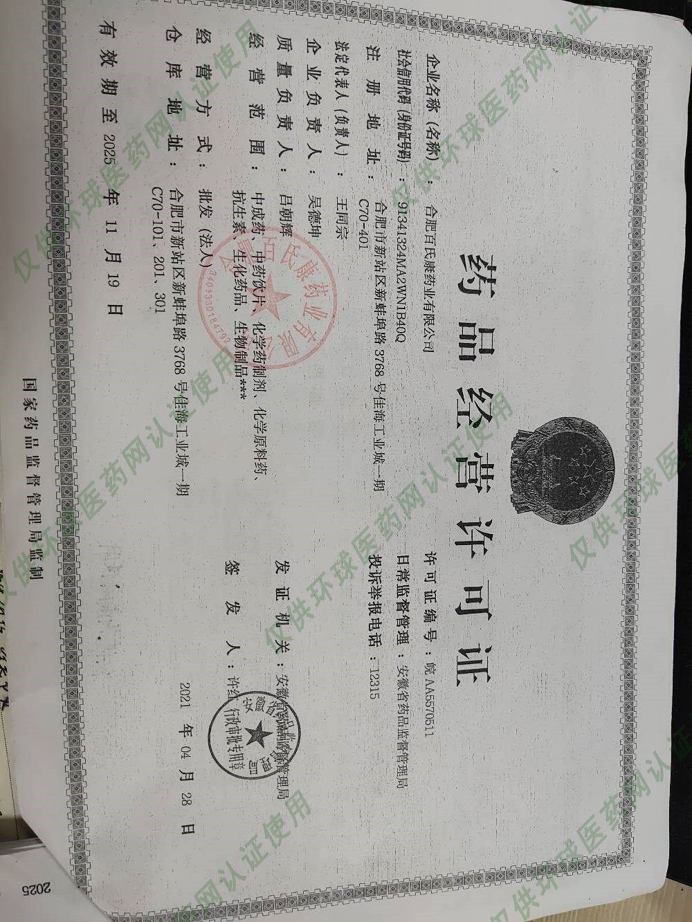 合肥百氏康藥業(yè)有限公司成立于2021年01月29日,注冊地位于合肥市新站區(qū)新蚌埠路3768號佳海工業(yè)城一期C70-401,法定代表人為王同宗。經(jīng)營范圍包括中成藥、中藥飲片、化學(xué)藥制劑、化學(xué)原料藥、抗生素、生化藥品、生物制品(除疫苗)、診斷藥品、預(yù)包裝食品,保健食品、保健用品、醫(yī)療器械、特殊醫(yī)學(xué)用途配方食品、嬰幼兒配方乳粉、嬰幼兒配方食品、日用百貨、消毒用品(除危險品)、化妝品銷售(含網(wǎng)上);醫(yī)藥咨詢;會務(wù)、倉儲服務(wù)(除危險品);房屋租賃;藥品研發(fā)、生產(chǎn);互聯(lián)網(wǎng)藥品信息服務(wù);計算機(jī)網(wǎng)絡(luò)信息咨詢服務(wù);增值電信業(yè)務(wù);廣告設(shè)計、制作、代理、發(fā)布;勞動保護(hù)用品、醫(yī)藥科技產(chǎn)品的技術(shù)開發(fā)、技術(shù)咨詢、技術(shù)轉(zhuǎn)讓及技術(shù)服務(wù)。(依法須經(jīng)批準(zhǔn)的項目,經(jīng)相關(guān)部門批準(zhǔn)后方可開展經(jīng)營活動)