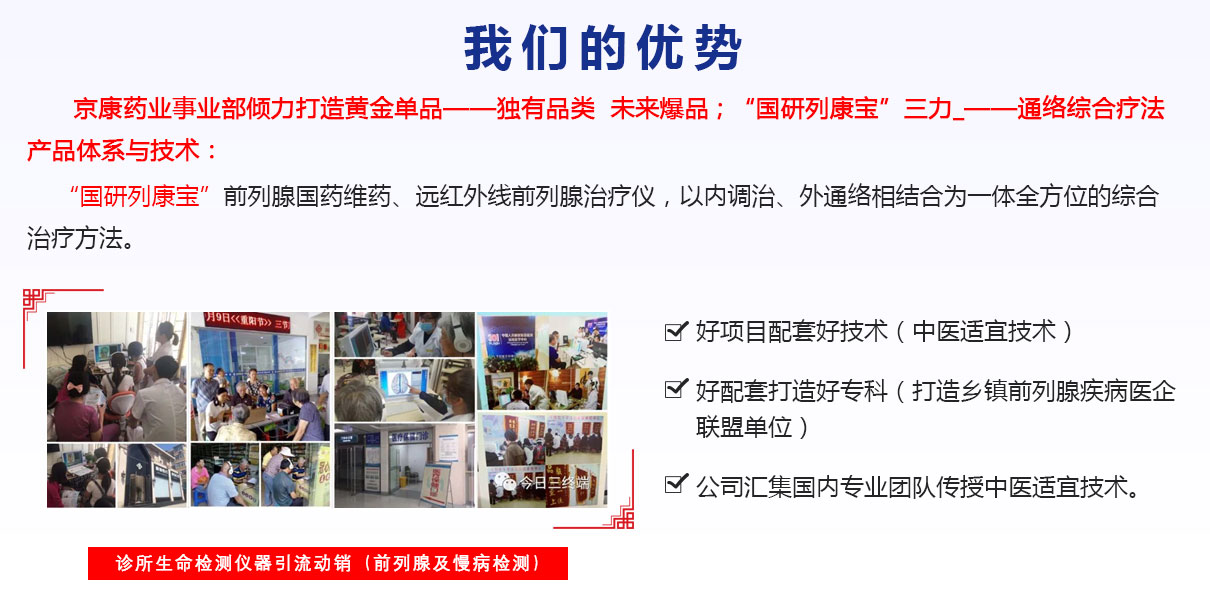 京康藥業(yè)事業(yè)部傾力打造黃金單品——; “國研列康寶”三力-通絡(luò)綜合療法 產(chǎn)品體系與技術(shù):“國研列康寶”前列腺國藥維藥、遠(yuǎn)紅外線前列腺治療儀,以內(nèi)調(diào)治、外通絡(luò)相結(jié)合為一體全方位的綜合治療方法。