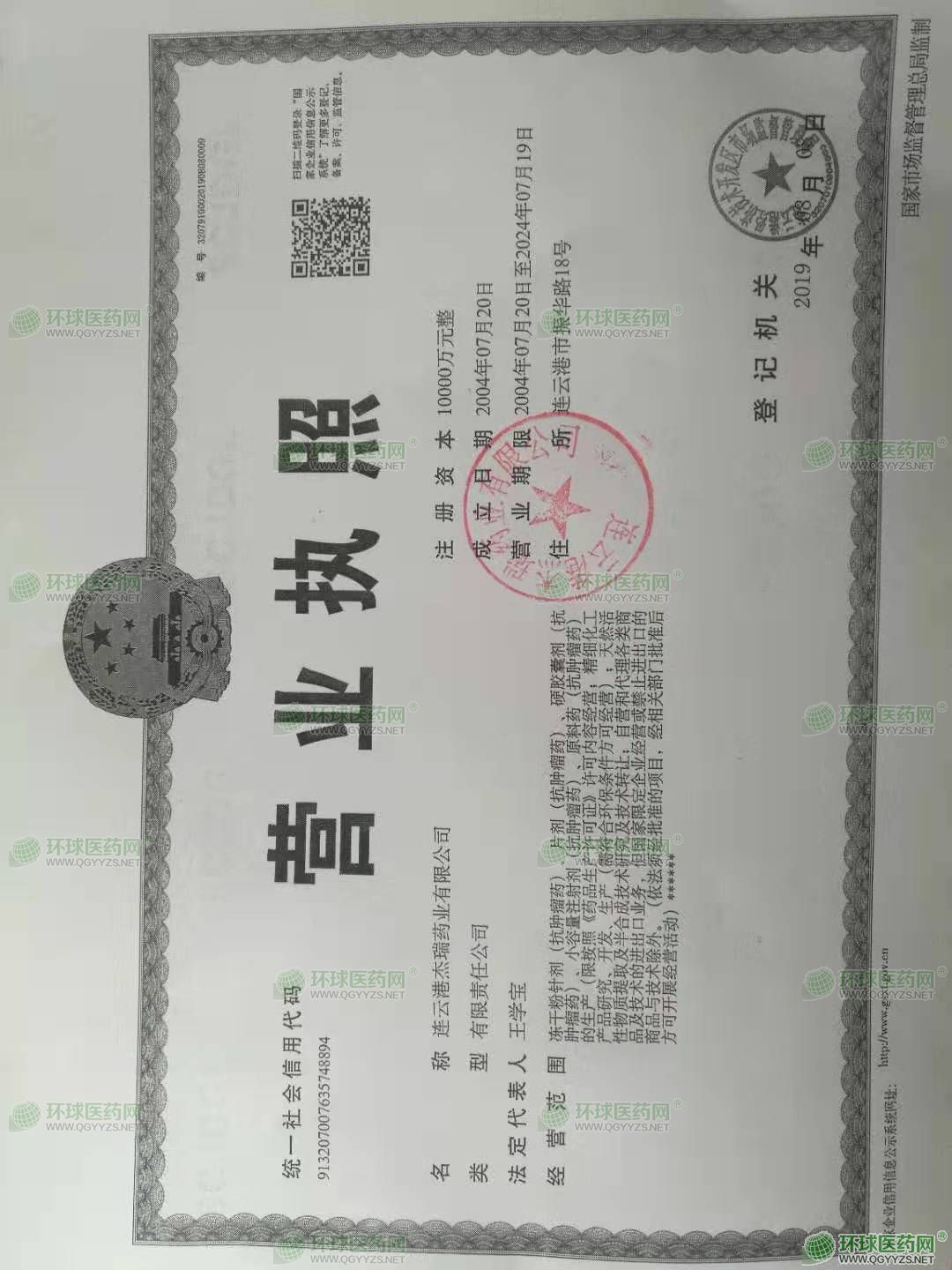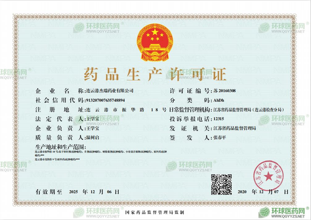 連云港杰瑞藥業(yè)有限公司成立于2004年07月20日,注冊(cè)地位于連云港市振華路18號(hào),法定代表人為王學(xué)寶。經(jīng)營(yíng)范圍包括凍干粉針劑(抗腫瘤藥)、片劑(抗腫瘤藥)、硬膠囊劑(抗腫瘤藥)、小容量注射劑(抗腫瘤藥)、原料藥(抗腫瘤藥)的生產(chǎn)(限按照《藥品生產(chǎn)許可證》許可內(nèi)容經(jīng)營(yíng);精細(xì)化工產(chǎn)品研究、開(kāi)發(fā)、生產(chǎn)(需符合環(huán)保條件方可經(jīng)營(yíng));天然活性物質(zhì)提取及半合成技術(shù)研究及技術(shù)轉(zhuǎn)讓;自營(yíng)和代理各類商品及技術(shù)的進(jìn)出口業(yè)務(wù),但國(guó)家限定企業(yè)經(jīng)營(yíng)或禁止進(jìn)出口的商品與技術(shù)除外。(依法須經(jīng)批準(zhǔn)的項(xiàng)目,經(jīng)相關(guān)部門批準(zhǔn)后方可開(kāi)展經(jīng)營(yíng)活動(dòng))許可項(xiàng)目:保健食品生產(chǎn)(依法須經(jīng)批準(zhǔn)的項(xiàng)目,經(jīng)相關(guān)部門批準(zhǔn)后方可開(kāi)展經(jīng)營(yíng)活動(dòng),具體經(jīng)營(yíng)項(xiàng)目以審批結(jié)果為準(zhǔn))連云港杰瑞藥業(yè)有限公司對(duì)外投資1家公司。