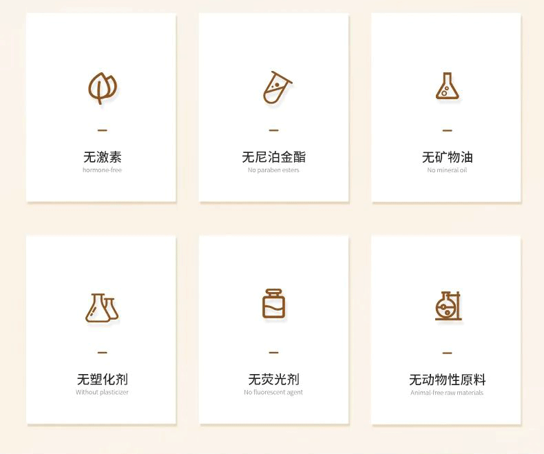 1、精心選取原料,合理配比,不含下列6大類成分,可安心使用。