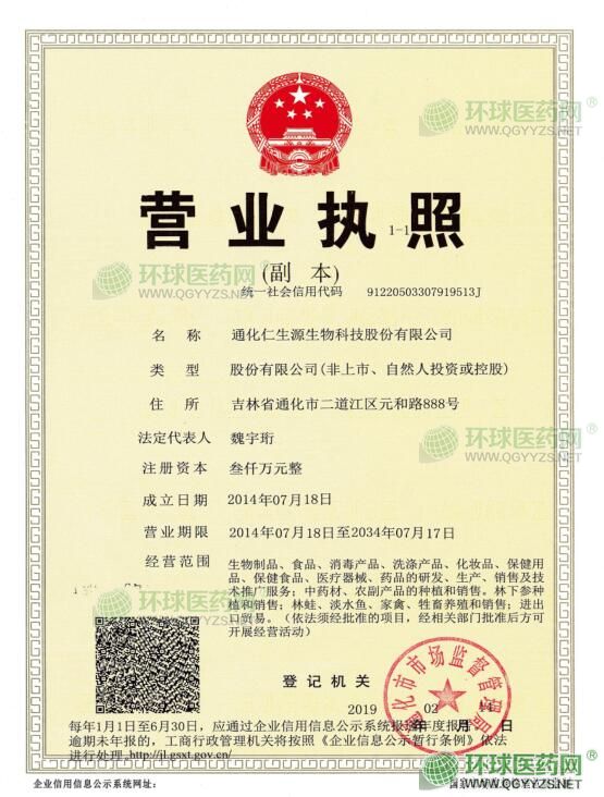 通化仁生源生物科技股份有限公司成立于2014年07月18日,注冊(cè)地位于吉林省通化市二道江區(qū)元和路888號(hào),法定代表人為魏宇珩。經(jīng)營(yíng)范圍包括許可項(xiàng)目:消毒劑生產(chǎn)(不含危險(xiǎn)化學(xué)品);用于傳染病防治的消毒產(chǎn)品生產(chǎn);食品生產(chǎn);食品銷售;食品用洗滌劑生產(chǎn);化妝品生產(chǎn);保健用品(非食品)生產(chǎn);保健食品生產(chǎn);藥品生產(chǎn);藥品批發(fā);水產(chǎn)養(yǎng)殖;家禽飼養(yǎng);牲畜飼養(yǎng)。(依法須經(jīng)批準(zhǔn)的項(xiàng)目,經(jīng)相關(guān)部門(mén)批準(zhǔn)后方可開(kāi)展經(jīng)營(yíng)活動(dòng),具體經(jīng)營(yíng)項(xiàng)目以相關(guān)部門(mén)批準(zhǔn)文件或許可證件為準(zhǔn))一般項(xiàng)目:消毒劑銷售(不含危險(xiǎn)化學(xué)品);專業(yè)保潔、清洗、消毒服務(wù);日用化學(xué)產(chǎn)品制造;互聯(lián)網(wǎng)銷售(除銷售需要許可的商品);醫(yī)用口罩批發(fā);醫(yī)護(hù)人員防護(hù)用品批發(fā);地產(chǎn)中草藥(不含中藥飲片)購(gòu)銷;中草藥種植;中草藥收購(gòu);貨物進(jìn)出口;家用電器銷售;健康咨詢服務(wù)(不含診療服務(wù));醫(yī)學(xué)研究和試驗(yàn)發(fā)展。(除依法須經(jīng)批準(zhǔn)的項(xiàng)目外,憑營(yíng)業(yè)執(zhí)照依法自主開(kāi)展經(jīng)營(yíng)活動(dòng))通化仁生源生物科技股份有限公司對(duì)外投資2家公司。