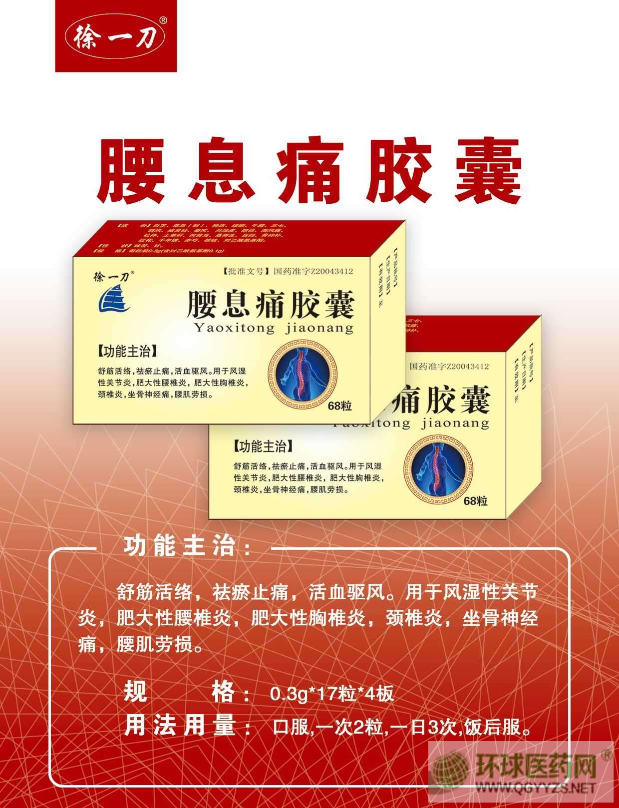 - 腰息痛膠囊(徐一刀) 批準(zhǔn)文號: 國藥準(zhǔn)字Z20043412規(guī) 格: 0.3g*17粒*4板