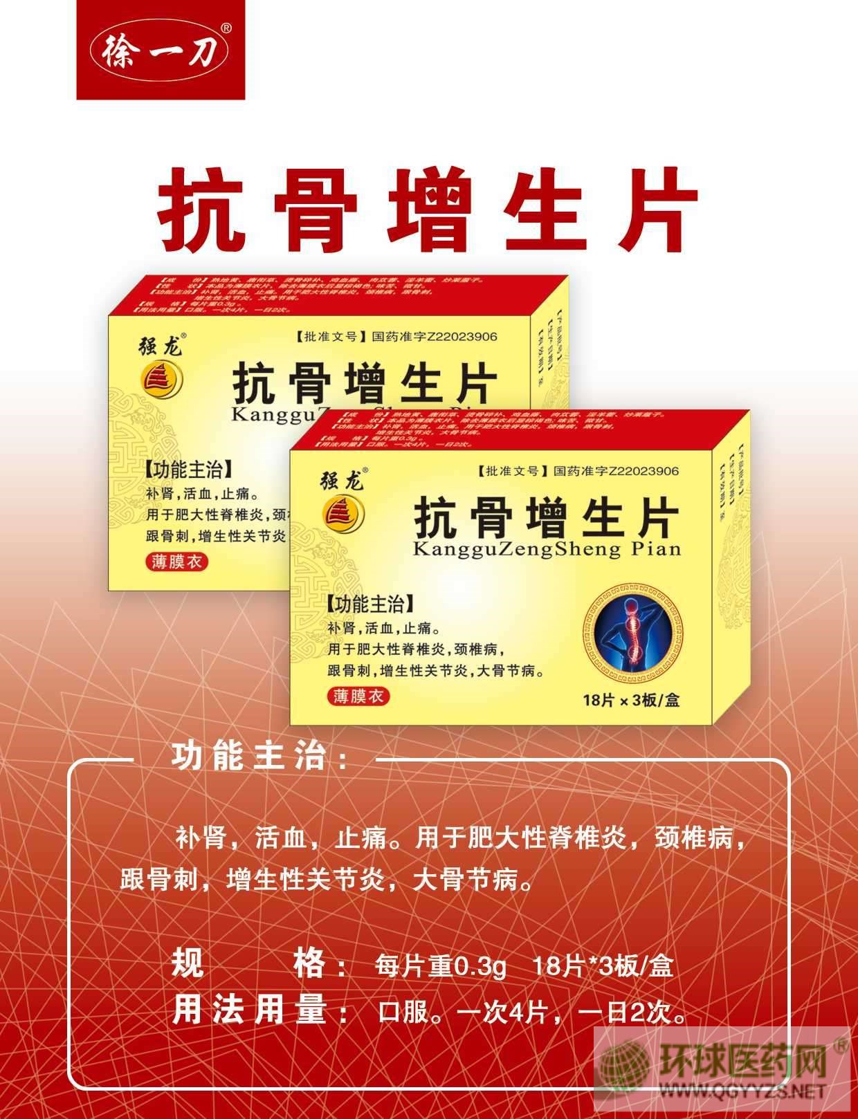 - 抗骨增生片(徐一刀) 批準(zhǔn)文號(hào): 國(guó)藥準(zhǔn)字Z22023906規(guī) 格: 0.3g*18片*3板