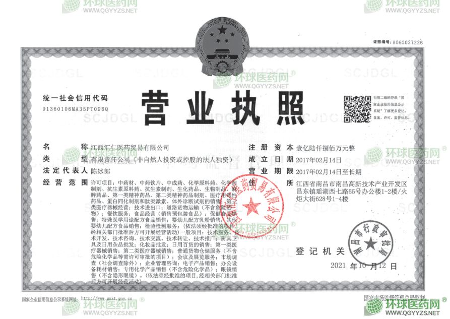 江西匯仁醫(yī)藥貿(mào)易有限公司成立于2017年02月14日,注冊地位于江西省南昌市南昌高新技術(shù)產(chǎn)業(yè)開發(fā)區(qū)昌東鎮(zhèn)瑤湖西七路55號辦公樓1-2樓/火炬大街628號1-4樓,法定代表人為陳冰郎。經(jīng)營范圍包括許可項目:中藥材、中藥飲片、中成藥、化學(xué)原料藥、化學(xué)藥制劑、抗生素原料藥、抗生素制劑、生化藥品、生物制品、麻醉藥品、**類精神藥品、第二類精神藥品制劑、醫(yī)療用毒性藥品、蛋白同化制劑和肽類激素、體外診斷試劑的銷售;第三類醫(yī)療器械經(jīng)營;技術(shù)進(jìn)出口;道路貨物運(yùn)輸(不含危險貨物);餐飲服務(wù);食品經(jīng)營(銷售預(yù)包裝食品);保健食品銷售;特殊醫(yī)學(xué)用途配方食品銷售;嬰幼兒配方乳粉銷售;其他嬰幼兒配方食品銷售;檢驗檢測服務(wù);(依法須經(jīng)批準(zhǔn)的項目,經(jīng)相關(guān)部門批準(zhǔn)后方可開展經(jīng)營活動)一般項目:技術(shù)服務(wù)、技術(shù)開發(fā)、技術(shù)咨詢、技術(shù)交流、技術(shù)轉(zhuǎn)讓、技術(shù)推廣;廚具衛(wèi)具及日用雜品批發(fā);化妝品批發(fā);日用百貨的銷售;**類醫(yī)療器械銷售;第二類醫(yī)療器械銷售;普通貨物倉儲服務(wù)(不含危險化學(xué)品等需許可審批的項目);會議及展覽服務(wù);市場調(diào)查(社會調(diào)查除外);企業(yè)管理咨詢;電子產(chǎn)品銷售;辦公設(shè)備耗材銷售;專用化學(xué)產(chǎn)品銷售(不含危險化學(xué)品);眼鏡銷售(不含隱形眼鏡)。(依法須經(jīng)批準(zhǔn)的項目,經(jīng)相關(guān)部門批準(zhǔn)后方可開展經(jīng)營活動)江西匯仁醫(yī)藥貿(mào)易有限公司對外投資6家公司,具有7處分支機(jī)構(gòu)。