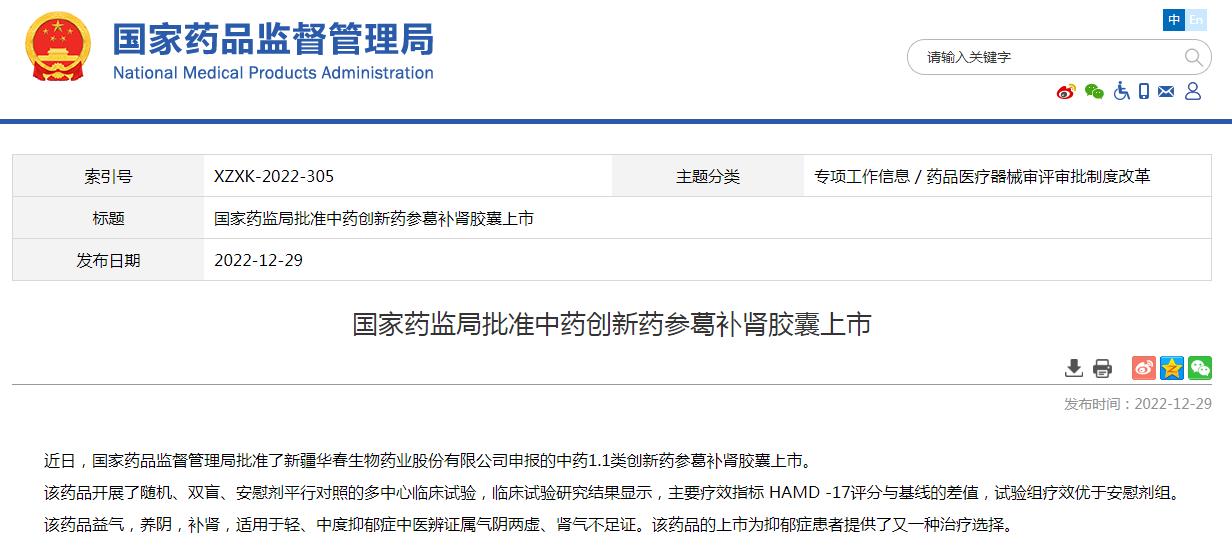 國家藥品監(jiān)督管理局于2022年12月29日批準(zhǔn)新疆華春生物藥業(yè)股份有限公司(以下簡稱華春藥業(yè))1.1類中藥創(chuàng)新藥抗抑郁癥“參葛補(bǔ)腎膠囊”上市許可,批準(zhǔn)證書編號:2022S01214;藥品批準(zhǔn)文號:國藥準(zhǔn)字Z20220008。