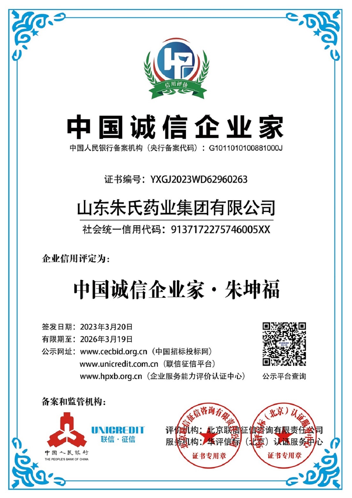 山東朱氏藥業(yè)集團董事長朱坤福先生榮獲中國誠信企業(yè)家稱號
