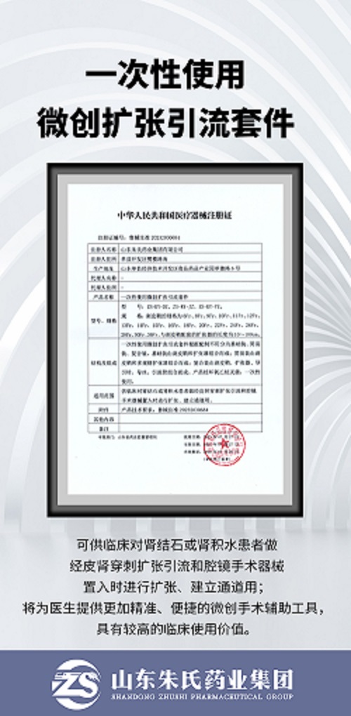 近日,山東朱氏藥業(yè)集團(tuán)子產(chǎn)品——一次性使用微創(chuàng)擴(kuò)張引流套件通過嚴(yán)格的審批流程,成功獲得由山東省藥品監(jiān)督管理局下發(fā)的中華人民共和國醫(yī)療器械注冊(cè)證!注冊(cè)證編號(hào)為:魯械注準(zhǔn)20232030684。本產(chǎn)品經(jīng)環(huán)氧乙烷滅菌處理,一次性使用,無菌衛(wèi)生;可供臨床對(duì)腎結(jié)石或腎積水患者做經(jīng)皮腎穿刺擴(kuò)張引流和腔鏡手術(shù)器械置入時(shí)進(jìn)行擴(kuò)張、建立通道用;將為醫(yī)生提供更加精準(zhǔn)、便捷的微創(chuàng)手術(shù)輔助工具,具有較高的臨床使用價(jià)值。