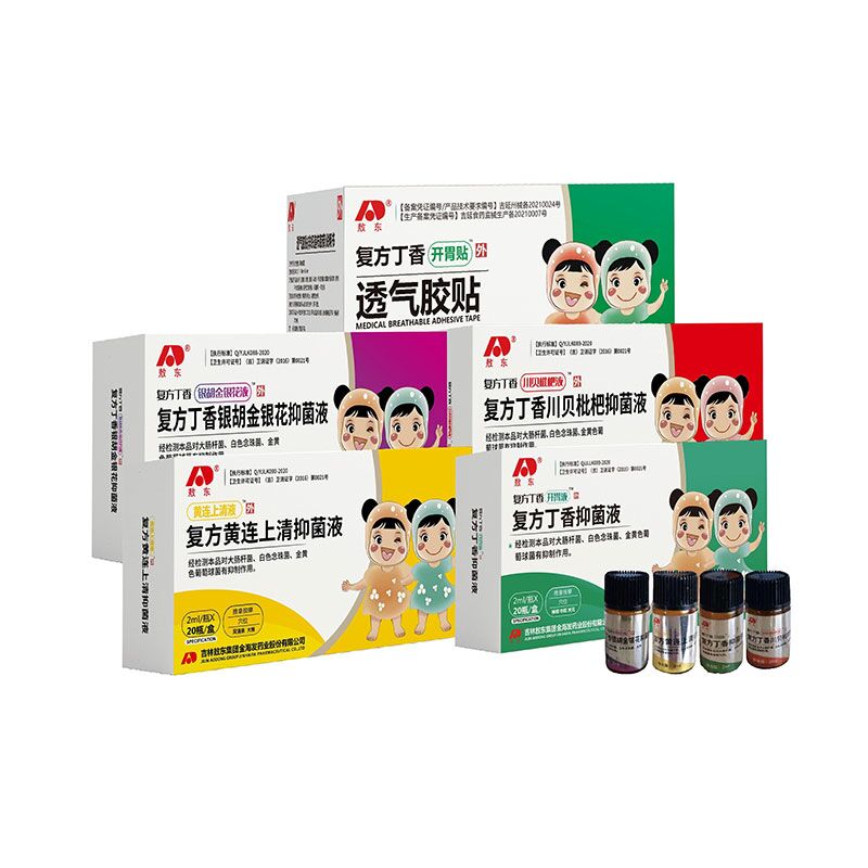 復方丁香兒科系列包含敖東復方丁香開胃貼™透氣膠貼和復方丁香銀胡金銀花抑菌液、復方黃連上清抑菌液、復方丁香抑菌液、復方丁香川貝枇杷抑菌液。
