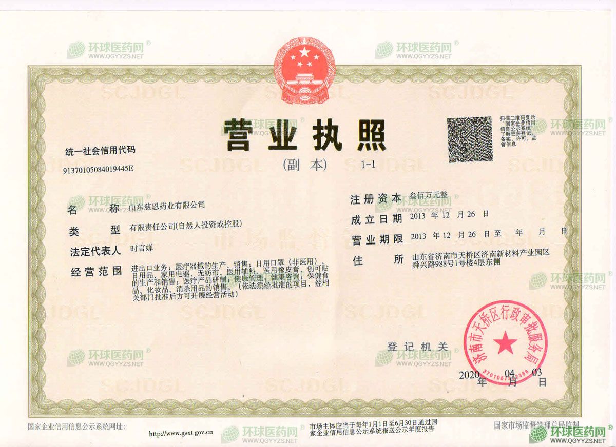 山東慈恩藥業(yè)有限公司成立于2013年12月26日,注冊(cè)地位于山東省濟(jì)南市天橋區(qū)濟(jì)南新材料產(chǎn)業(yè)園區(qū)舜興路988號(hào)1號(hào)樓4層?xùn)|側(cè),法定代表人為于程成。經(jīng)營(yíng)范圍包括進(jìn)出口業(yè)務(wù);醫(yī)療器械的生產(chǎn)、銷售;日用口罩(非醫(yī)用)、日用品、家用電器、無(wú)紡布、醫(yī)用輔料、醫(yī)用橡皮膏、創(chuàng)可貼的生產(chǎn)和銷售;醫(yī)療產(chǎn)品研制;健康管理;健康咨詢;保健食品、化妝品、消殺用品的銷售。(依法須經(jīng)批準(zhǔn)的項(xiàng)目,經(jīng)相關(guān)部門批準(zhǔn)后方可開展經(jīng)營(yíng)活動(dòng))