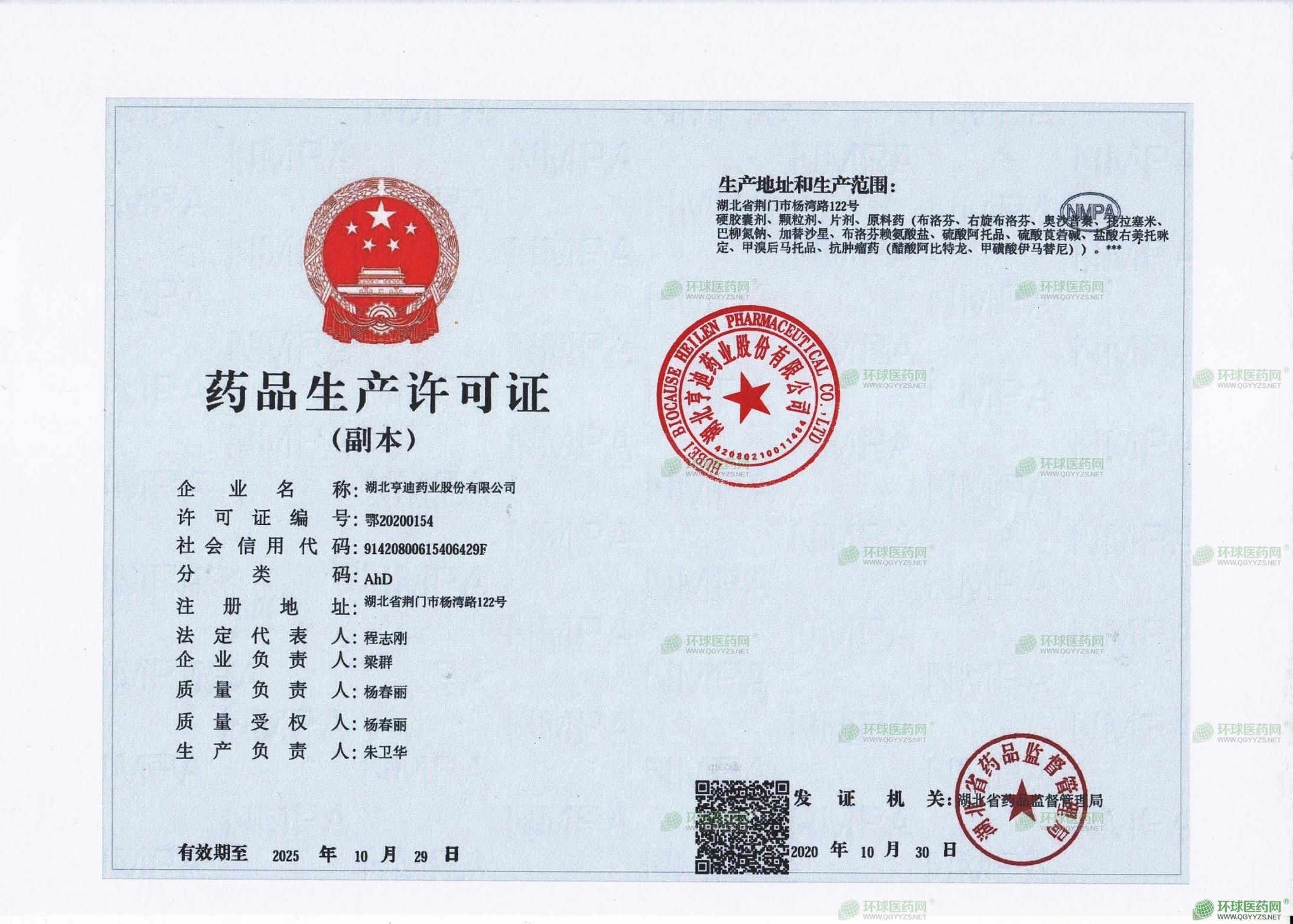 生產(chǎn)范圍: 湖北省荊門市楊灣路122號(hào) 硬膠囊劑、顆粒劑、片劑、原料藥(含抗腫瘤藥)。***