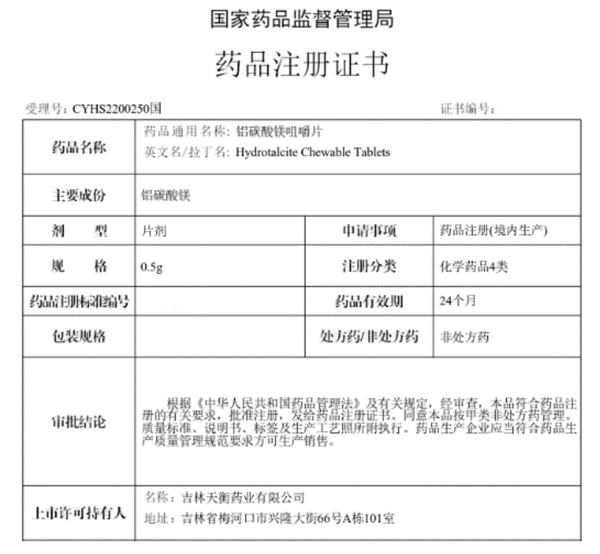 2023年7月27日,天衡藥業(yè)持有的鋁碳酸鎂咀嚼片成功獲得生產(chǎn)批件,批準(zhǔn)文號(hào)【國(guó)藥準(zhǔn)字H20233937】,這也是天衡藥業(yè)作為藥品上市許可持有人獲批的第三個(gè)產(chǎn)品。