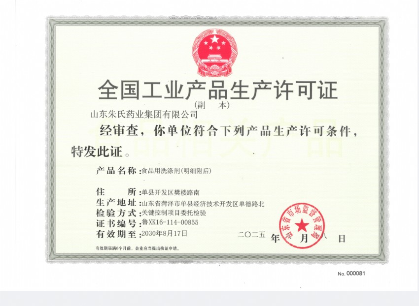 喜訊!山東朱氏藥業(yè)集團獲食品用洗滌劑生產(chǎn)許可證!