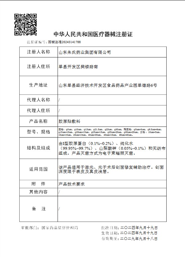 在醫(yī)用敷料領域,“械字號” 等級直接決定產品的市場準入與信任權重,而三類醫(yī)療器械注冊證更是公認的 “行業(yè)*高門檻”。山東朱氏這款膠原貼能實現(xiàn)上市即**,首先源于其手握的國械注準 20243141788 號三類注冊證,這張證書背后是遠超普通產品的嚴苛考驗。