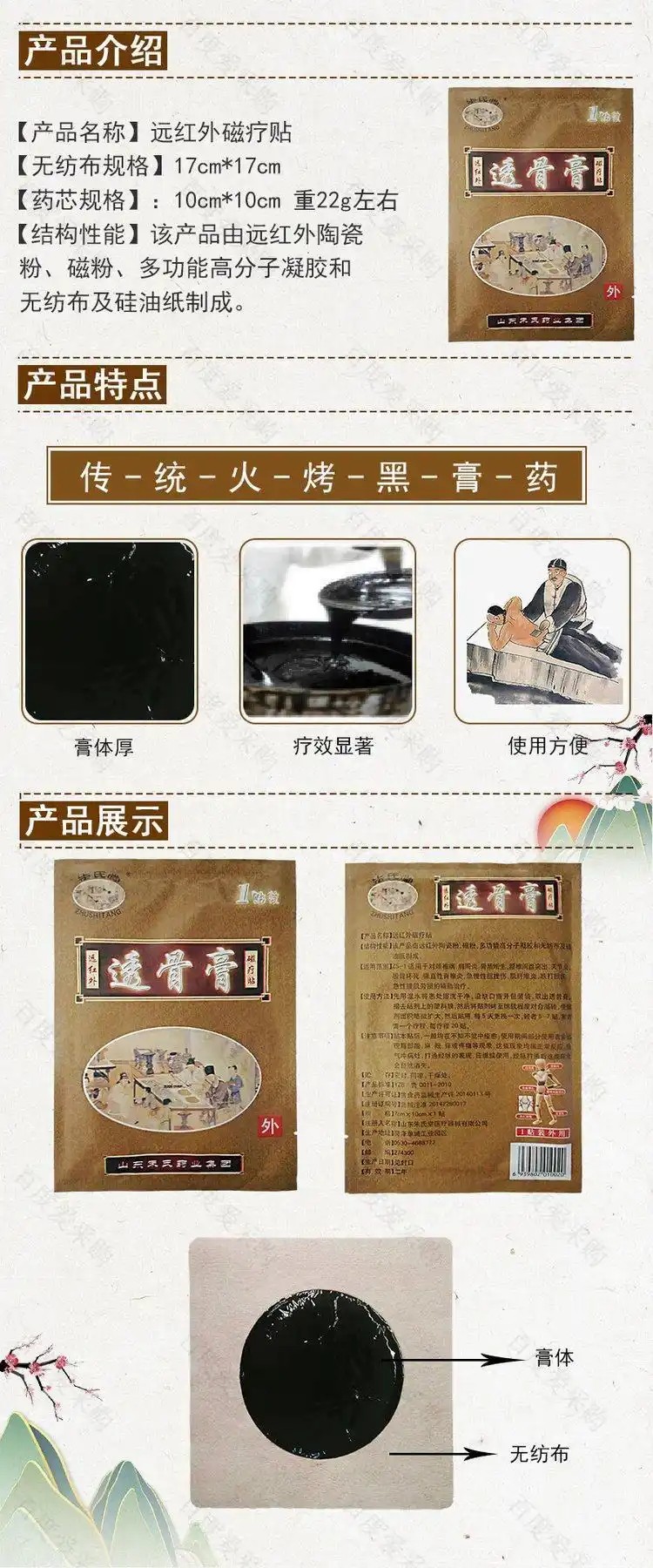 該透骨膏以當(dāng)歸、紅花、乳香、沒藥、獨活等 20 余味道地中藥材為原料,遵循 “君臣佐使” 的中醫(yī)配伍原則,通過 “泡、煎、熬、煉” 等多道傳統(tǒng)工藝制成,尤其針對頸肩腰腿痛、關(guān)節(jié)炎、肌肉勞損等常見筋骨問題,有著**的緩解效果。