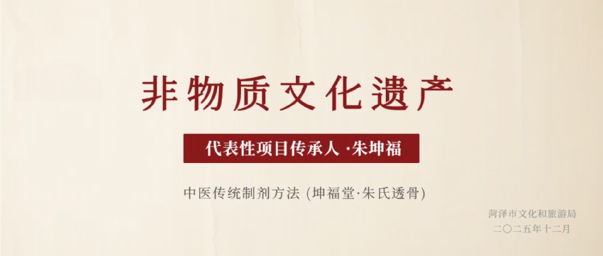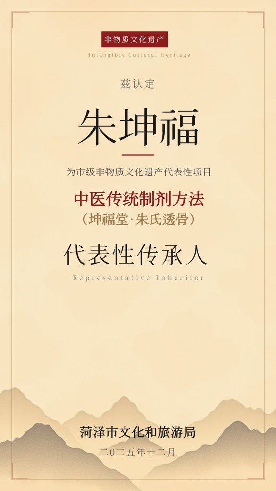 一項關(guān)乎菏澤中醫(yī)藥文化傳承的重要認(rèn)定正式揭曉。 經(jīng)菏澤市文化和旅游局嚴(yán)格評審與公示,朱坤福先生正式被認(rèn)定為市級非物質(zhì)文化遺產(chǎn)代表性項目“中醫(yī)傳統(tǒng)制劑方法(坤福堂·朱氏透骨膏)”的代表性傳承人。