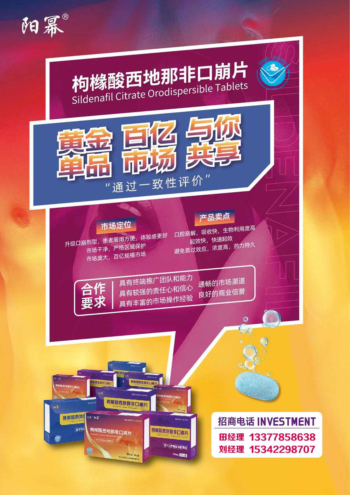 勃起功能障礙藥物—陽冪®枸櫞酸西地那非口崩片全國招商!全品規(guī),通過一致性評價,嚴(yán)格控銷!