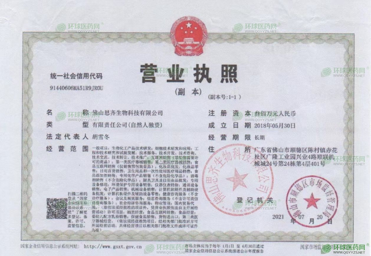 佛山思齊生物科技有限公司成立于2018年05月30日,注冊地位于廣東省佛山市順德區(qū)陳村鎮(zhèn)赤花社區(qū)廣隆工業(yè)園興業(yè)4路順聯(lián)機(jī)械城24號第24棟第4層401號,法定代表人為胡雪冬。經(jīng)營范圍包括一般項目:生物化工產(chǎn)品技術(shù)研發(fā);細(xì)胞技術(shù)研發(fā)和應(yīng)用;工程和技術(shù)研究和試驗發(fā)展;技術(shù)服務(wù)、技術(shù)開發(fā)、技術(shù)咨詢、技術(shù)交流、技術(shù)轉(zhuǎn)讓、技術(shù)推廣;互聯(lián)網(wǎng)銷售(除銷售需要許可的商品);**類醫(yī)療器械銷售;第二類醫(yī)療器械銷售;食品互聯(lián)網(wǎng)銷售(僅銷售預(yù)包裝食品);化妝品批發(fā);化妝品零售;日用百貨銷售;衛(wèi)生用品和一次性使用醫(yī)療用品銷售;食品添加劑銷售;專用化學(xué)產(chǎn)品銷售(不含危險化學(xué)品);消毒劑銷售(不含危險化學(xué)品);廚具衛(wèi)具及日用雜品批發(fā);專用設(shè)備修理;環(huán)境保護(hù)專用設(shè)備銷售;儀器儀表銷售;通訊設(shè)備銷售;電子產(chǎn)品銷售;機(jī)械設(shè)備銷售;計算機(jī)軟硬件及輔助設(shè)備批發(fā);計算機(jī)軟硬件及輔助設(shè)備零售;健康咨詢服務(wù)(不含診療服務(wù));會議及展覽服務(wù);信息咨詢服務(wù)(不含許可類信息咨詢服務(wù));社會經(jīng)濟(jì)咨詢服務(wù);物業(yè)管理;國內(nèi)貿(mào)易代理。(除依法須經(jīng)批準(zhǔn)的項目外,憑營業(yè)執(zhí)照依法自主開展經(jīng)營活動)許可項目:酒類經(jīng)營;食品互聯(lián)網(wǎng)銷售;食品經(jīng)營;嬰幼兒配方乳粉銷售;保健食品銷售;貨物進(jìn)出口;第三類醫(yī)療器械經(jīng)營。(依法須經(jīng)批準(zhǔn)的項目,經(jīng)相關(guān)部門批準(zhǔn)后方可開展經(jīng)營活動,具體經(jīng)營項目以相關(guān)部門批準(zhǔn)文件或許可證件為準(zhǔn))
