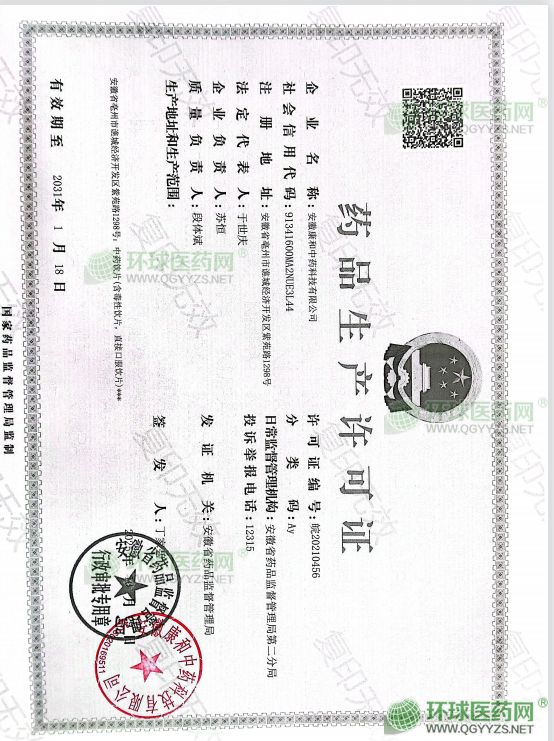發(fā)證機關(guān): 安徽省藥品監(jiān)督管理局