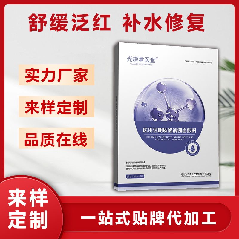 - 透明質(zhì)酸納醫(yī)用面貼修復(fù)敷料代加工定制廠家 批準(zhǔn)文號(hào): 冀械注準(zhǔn)20242140461規(guī) 格: 詳細(xì)信息見(jiàn)產(chǎn)品說(shuō)明書(shū)