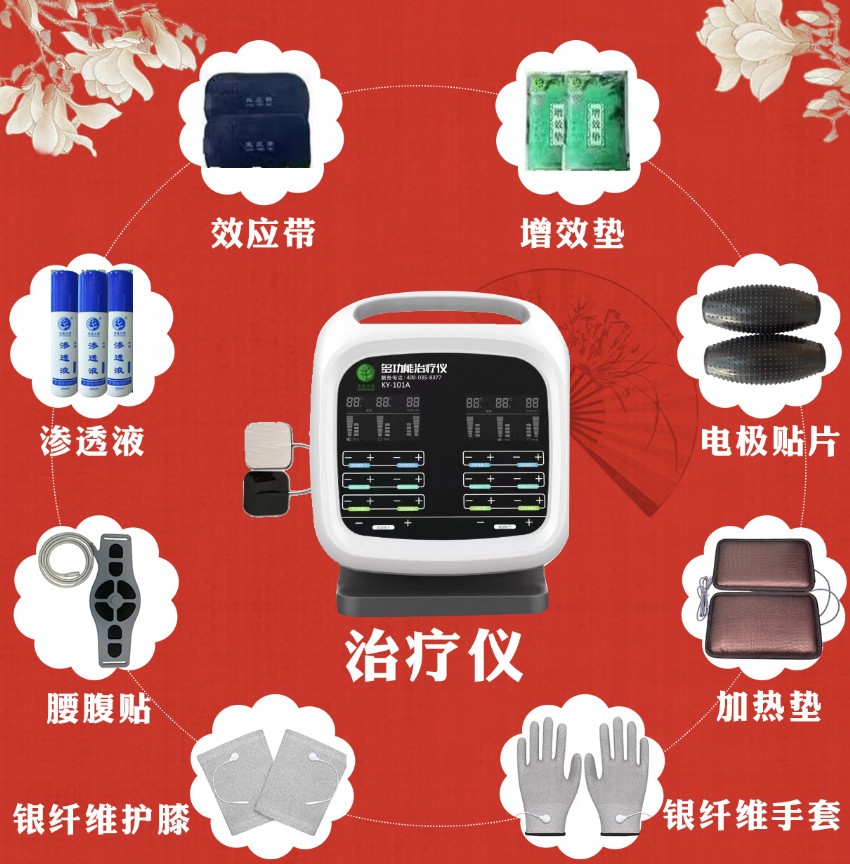 【成 份】KY-101A多功能治療儀由主機、效應帶、脈沖組件、増效墊、滲透液組成。