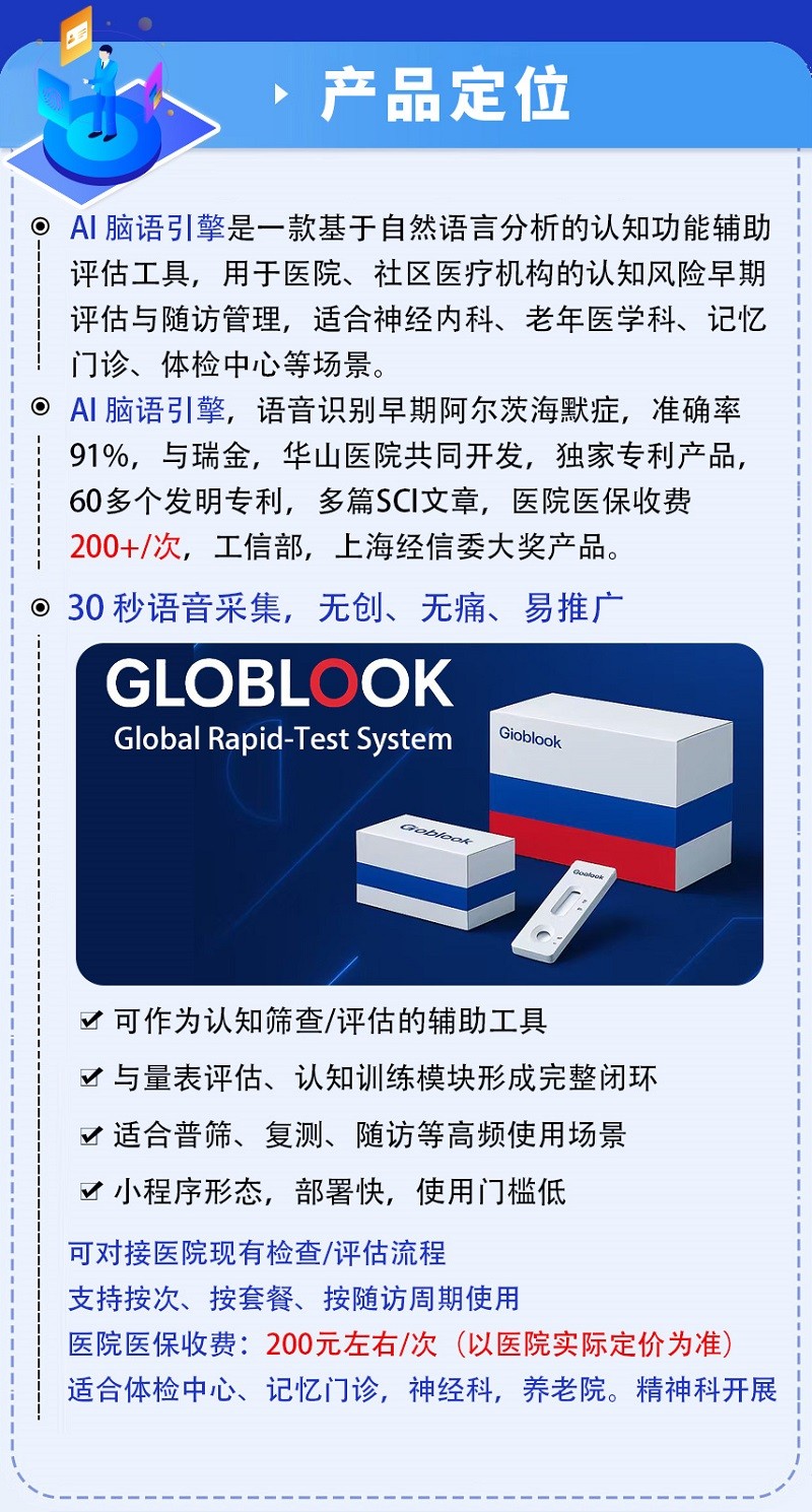 可適配APP、小程序、專用設(shè)備等多種形態(tài),無論是醫(yī)療機構(gòu)的門診篩查、社區(qū)的常態(tài)化檢測,還是體檢中心的套餐增值服務(wù),都能精準(zhǔn)適配。高性價比優(yōu)勢單次檢測成本僅為傳統(tǒng)MRI/腦脊液檢測的1/50,大幅降低機構(gòu)運營成本和用戶支付門檻,助力產(chǎn)品快速普及。