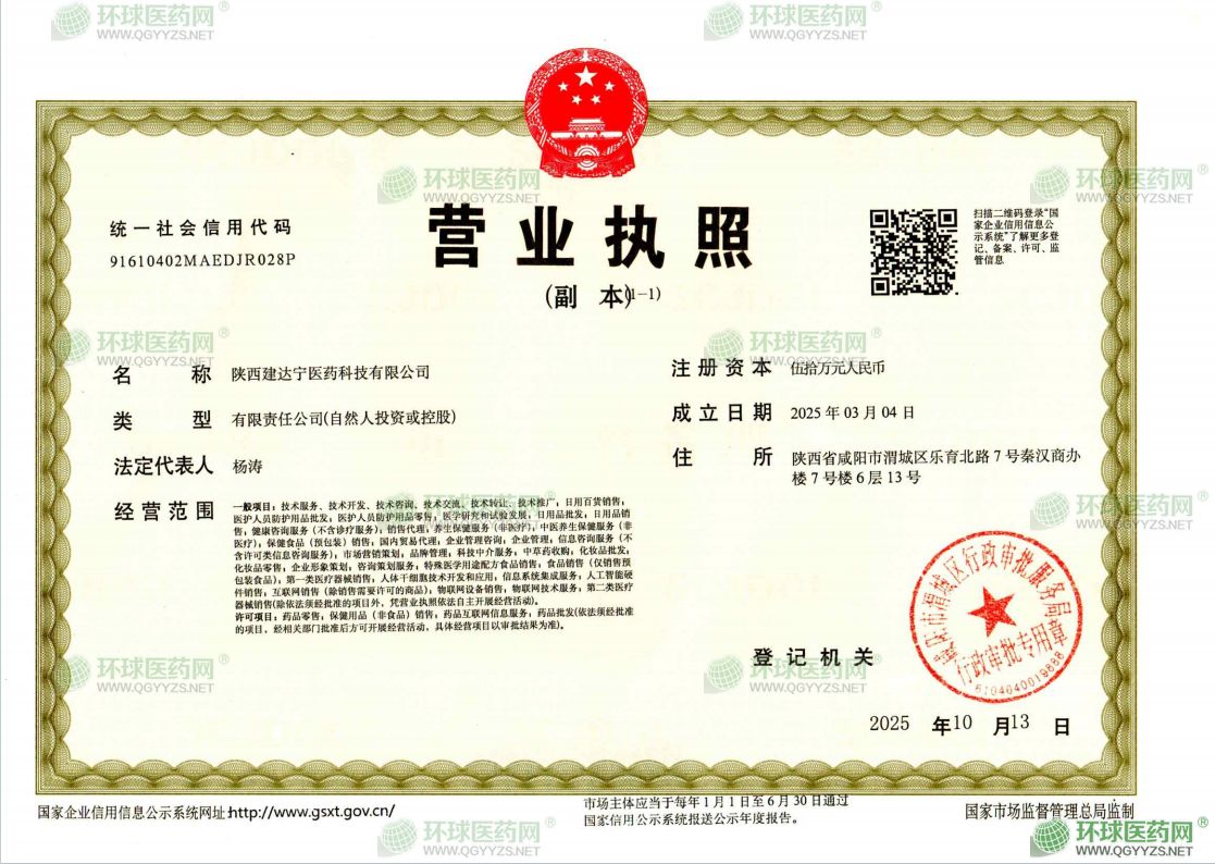 陜西建達寧醫(yī)藥科技有限公司成立于2025年03月04日,注冊地位于陜西省咸陽市渭城區(qū)樂育北路7號秦漢商辦樓7號樓6層13號,法定代表人為楊濤。經營范圍包括一般項目:技術服務、技術開發(fā)、技術咨詢、技術交流、技術轉讓、技術推廣;日用百貨銷售;醫(yī)護人員防護用品批發(fā);醫(yī)護人員防護用品零售;醫(yī)學研究和試驗發(fā)展;日用品批發(fā);日用品銷售;健康咨詢服務(不含診療服務);銷售代理;養(yǎng)生保健服務(非醫(yī)療);中醫(yī)養(yǎng)生保健服務(非醫(yī)療);保健食品(預包裝)銷售;國內貿易代理;企業(yè)管理咨詢;企業(yè)管理;信息咨詢服務(不含許可類信息咨詢服務);市場營銷策劃;品牌管理;科技中介服務;中草藥收購;化妝品批發(fā);化妝品零售;企業(yè)形象策劃;咨詢策劃服務;特殊醫(yī)學用途配方食品銷售;食品銷售(僅銷售預包裝食品);**類醫(yī)療器械銷售;人體干細胞技術開發(fā)和應用;信息系統(tǒng)集成服務;人工智能硬件銷售;互聯(lián)網銷售(除銷售需要許可的商品);物聯(lián)網設備銷售;物聯(lián)網技術服務;第二類醫(yī)療器械銷售(除依法須經批準的項目外,憑營業(yè)執(zhí)照依法自主開展經營活動)。許可項目:藥品零售;保健用品(非食品)銷售;藥品互聯(lián)網信息服務;藥品批發(fā)(依法須經批準的項目,經相關部門批準后方可開展經營活動,具體經營項目以審批結果為準)。