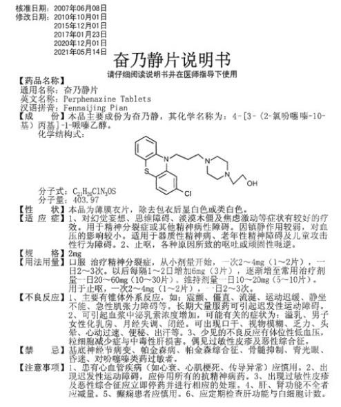 - 奮乃靜片 【藥品名稱(chēng)】 通用名稱(chēng):奮乃靜片 英文名稱(chēng):PerphenazineT