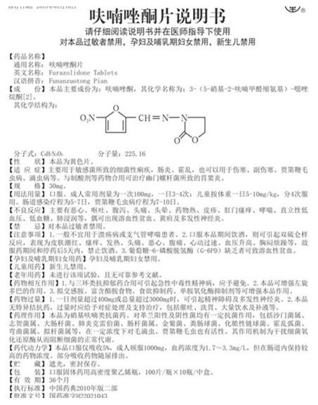 【藥理】本品為硝基呋喃類抗菌藥。對革蘭陽性及陰性菌均有一定抗菌作用,包括沙門菌屬、志賀菌屬、大腸桿菌、肺炎克雷伯菌、腸桿菌屬、金葡菌、糞腸球菌、化膿性鏈球菌、霍亂弧菌、彎曲菌屬、擬桿菌屬等,在一定濃度下對毛滴蟲、賈第鞭毛蟲也有活性。其作用機制為干擾細菌氧化還原酶從而阻斷細菌的正常代謝。