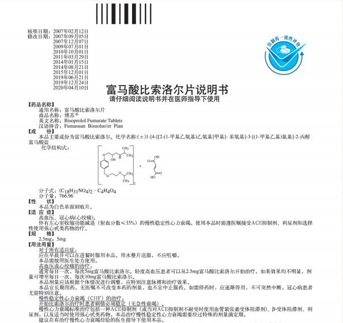 【用法用量】對于所有適應(yīng)癥:應(yīng)在早晨并可以在進(jìn)餐時服用本品。用水整片送服,不應(yīng)咀嚼。本品需按照醫(yī)生處方使用。高血壓或心絞痛的治療:通常每日一次,每次5mg富馬酸比索洛爾。輕度高血壓患者可以從2.5mg富馬酸比索洛爾開始治療。如果效果均不明顯,劑量可增至每日一次,每次10mg富馬酸比索洛爾。本品劑量應(yīng)該根據(jù)個體情況進(jìn)行調(diào)整,應(yīng)特別注意脈搏和治療效果。本品宜長期用藥。無醫(yī)囑不可改變本藥的劑量,也不宜中止服藥。如需停藥時,應(yīng)逐漸停用,不可突然中斷。冠心病患者尤需特別注意。慢性穩(wěn)定性心力衰竭(CHF)的治療:開始比索洛爾治療時患者病情必須穩(wěn)定(無急性衰竭)。慢性心力衰竭標(biāo)準(zhǔn)治療包括一種ACE抑制劑(或當(dāng)對ACE抑制劑不耐受時使用血管緊張素受體阻滯劑)、β-受體阻滯劑、利尿劑,以及適當(dāng)時使用強心甙類藥物。本品治療慢性穩(wěn)定性心力衰竭需要經(jīng)過特殊的劑量滴定期。建議在有治療慢性心力衰竭經(jīng)驗的醫(yī)生指導(dǎo)下使用本品。注意:本品治療慢性穩(wěn)定性心力衰竭必須首先經(jīng)過下文所描述的劑量滴定期。使用比索洛爾治療慢性穩(wěn)定性心力衰竭應(yīng)從低劑量開始,按以下方案逐漸增加劑量:1.25mg,每日1次,用藥1周,如果耐受性良好,則增加至2.5mg,每日1次,繼續(xù)用藥1周,如果耐受性良好,則增加至3.75mg,每日1次,繼續(xù)用藥l周,如果耐受性良好,則增加至5mg,每日1次,繼續(xù)用藥4周,如果耐受性良好,則增加至7.5mg,每日1次,繼續(xù)用藥4周,如果耐受性良好,則增加至10mg,每日1次,作為維持治療最大推薦劑量為10mg,每日1次。建議在首次服用后及劑量遞增期間嚴(yán)密監(jiān)測生命體征(血壓、心率)、傳導(dǎo)阻滯和心力衰竭惡化的癥狀。劑量調(diào)整如果出現(xiàn)暫時的心力衰竭惡化、低血壓或心動過緩,建議重新考慮合并用藥的劑量。如有必要可以暫時降低比索洛爾的劑量,或考慮停藥。當(dāng)病情穩(wěn)定后考慮重新開始比索洛爾治療和/或上調(diào)比索洛爾劑量。使用本品治療慢性穩(wěn)定性心力衰竭應(yīng)長期用藥。若沒有醫(yī)師指導(dǎo),不得突然停藥或變更劑量,因為可能導(dǎo)致暫時的病情惡化。尤其對于伴有缺血性心臟病患者不得突然停藥。如果需要停藥,建議逐步降低劑量。特殊人群肝、腎功能不全者高血壓或心絞痛治療:輕、中度肝、腎功能不全的患者通常不需要調(diào)整劑量。嚴(yán)重腎功能衰竭(肌酐清除率<20ml/min)和嚴(yán)重肝功能異常的患者,每日劑量不得超過10mg。腎透析患者使用比索洛爾的經(jīng)驗較少;但也沒有證據(jù)表明該類患者的劑量需要調(diào)整。慢性穩(wěn)定性心力衰竭的治療:尚無比索洛爾治療慢性心力衰竭并伴有肝、腎功能不全患者的藥代動力學(xué)數(shù)據(jù)。此類患者的劑量遞增應(yīng)特別謹(jǐn)慎。老年患者:不需要劑量調(diào)整。