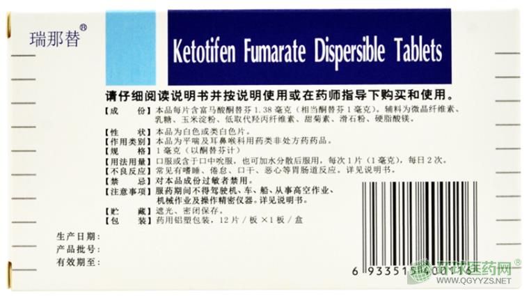 - 本頁面信息僅供參考,請以產(chǎn)品實(shí)際附帶說明書為準(zhǔn)。 瑞那替富馬酸酮替芬分散片 說明書 圖片版 瑞那替富馬酸酮替芬分散片