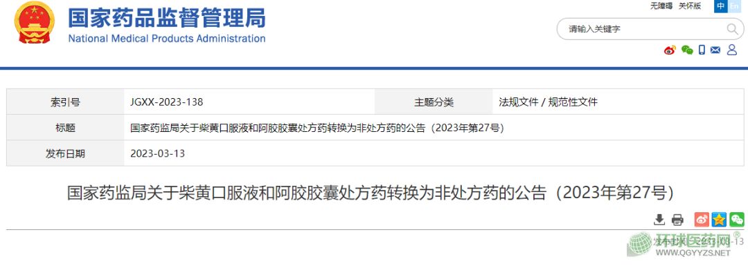 - 2023年03月13日,國家藥監(jiān)局發(fā)布了柴黃 口服液 和阿膠 膠囊 由處方藥轉(zhuǎn)換為非 處方藥 公告,要求MHA在2023年9月7日前完成說明書修訂及備案