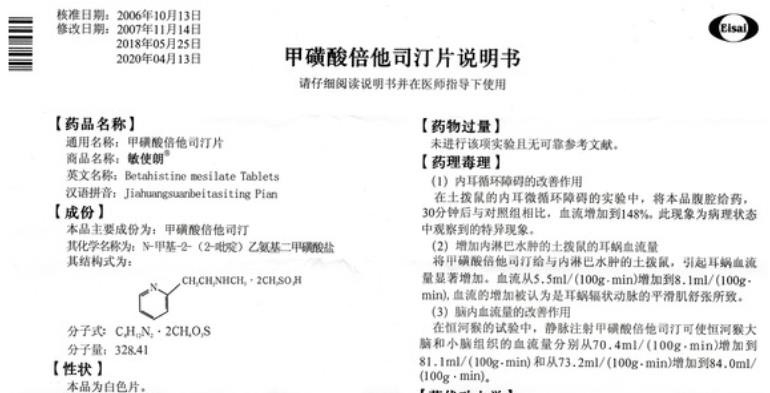【藥品名稱】通用名稱:甲磺酸倍他司汀片