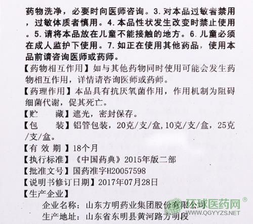 - 本頁(yè)面信息僅供參考,請(qǐng)以產(chǎn)品實(shí)際附帶說(shuō)明書(shū)為準(zhǔn)。 方明藥業(yè) 甲硝唑凝膠 說(shuō)明書(shū)文字版 暫無(wú) 方明藥業(yè) 甲硝唑凝膠 說(shuō)明書(shū)圖片版