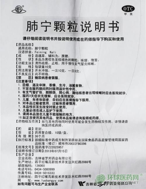 - 本頁(yè)面信息僅供參考,請(qǐng)以產(chǎn)品實(shí)際附帶說明書為準(zhǔn)。 吉林羅邦肺寧顆粒說明書圖片版(2013年版) 吉林羅邦 肺寧顆粒 說明書