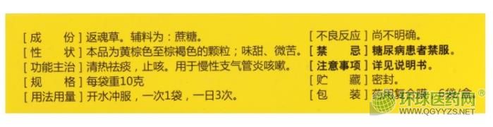 - 本頁(yè)面信息僅供參考,請(qǐng)以產(chǎn)品實(shí)際附帶說明書為準(zhǔn)。 萬通牌肺寧顆粒 (返魂草)說明書圖片版(2011年版) 萬通牌肺寧顆粒 (返