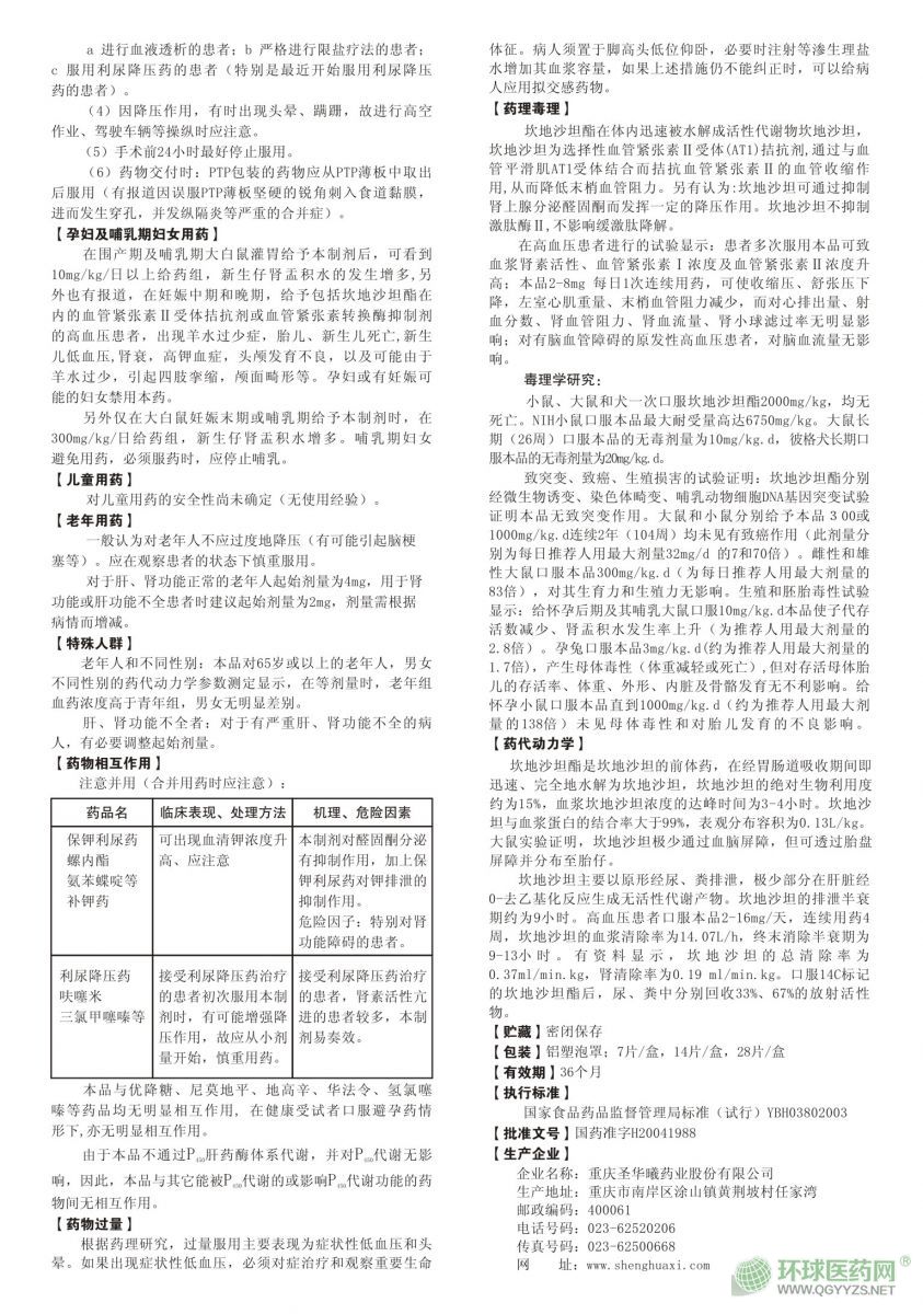 - 本頁面信息僅供參考,請(qǐng)以產(chǎn)品實(shí)際附帶說明書為準(zhǔn)。 重慶圣華曦 坎地沙坦酯片 說明書文字版 見以下圖片版 重慶圣華曦 坎地沙坦酯