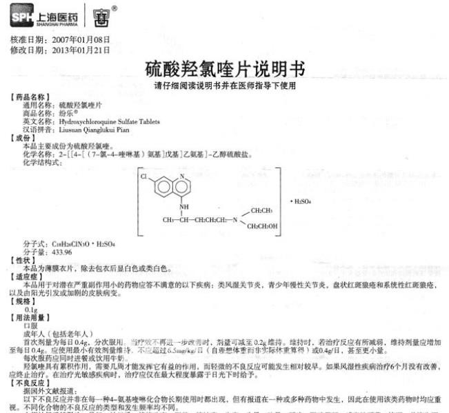 西藥、處方藥、醫(yī)保乙類。用于治療盤狀紅斑狼瘡及系統(tǒng)性紅斑狼瘡。多家企業(yè)生產(chǎn)。目前安徽華源醫(yī)藥股份有限公司在環(huán)球醫(yī)藥網(wǎng)招商。【藥品名稱】通用名稱:硫酸羥氯喹片