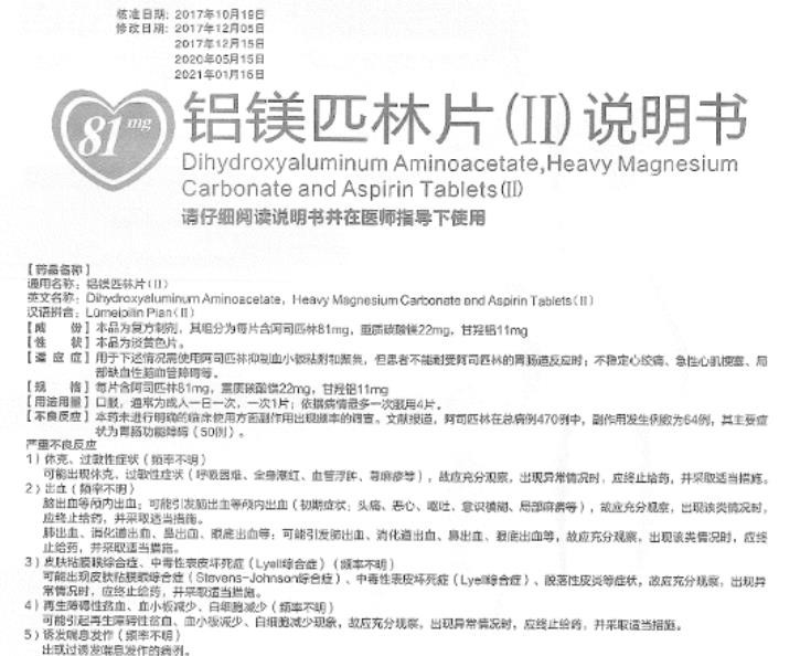 【規(guī)格】每片含阿司匹林81mg,重質(zhì)碳酸鎂22mg,甘羥鋁11mg