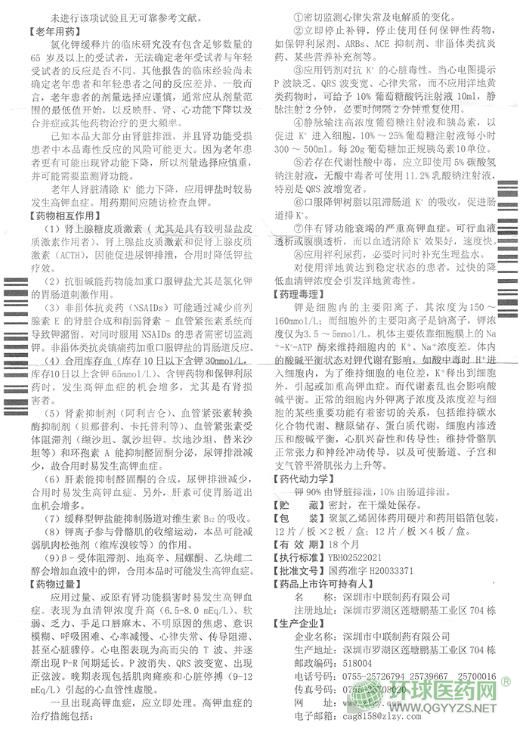 - 本頁面信息僅供參考,請(qǐng)以產(chǎn)品實(shí)際附帶說明書為準(zhǔn)。 補(bǔ)佳泰 氯化鉀緩釋片 (深圳市中聯(lián))說明書文字版 【藥品名稱】 氯化鉀緩釋片(補(bǔ)