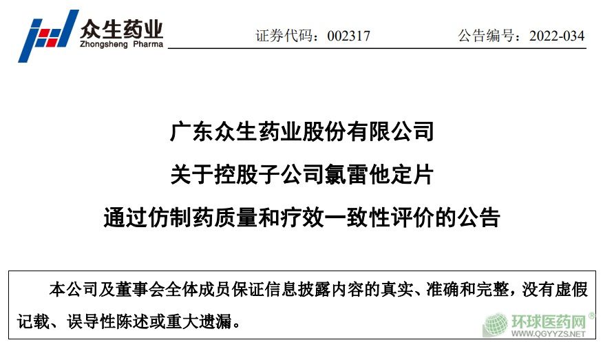 - 4月22日,眾生藥業(yè)發(fā)布公告稱,控股子公司逸舒制藥收到國家藥監(jiān)局批準(zhǔn)簽發(fā)的《藥品補(bǔ)充申請批準(zhǔn)通知書》,氯雷他定片通過了仿制藥質(zhì)量和療