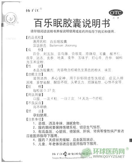 - 本頁(yè)面信息僅供參考,請(qǐng)以產(chǎn)品實(shí)際附帶說(shuō)明書(shū)為準(zhǔn)。 揚(yáng)子江牌 百樂(lè)眠膠囊 說(shuō)明書(shū) 文字版 商品名:百樂(lè)眠 通用名:百樂(lè)眠膠囊
