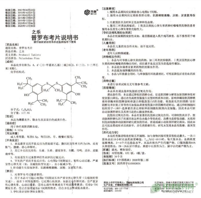 - 本頁(yè)面信息僅供參考,請(qǐng)以產(chǎn)品實(shí)際附帶說(shuō)明書(shū)為準(zhǔn)。 齊魯制藥之樂(lè) 普羅布考片 外包裝 齊魯制藥之樂(lè)普羅布考片說(shuō)明書(shū)(202