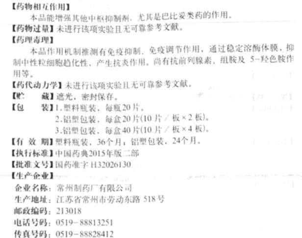 【藥理】本品作用機制推測有免疫抑制、免疫調(diào)節(jié)作用,通過穩(wěn)定溶酶體膜,抑制中性粒細胞趨化性,產(chǎn)生抗炎作用。尚有抗前列腺素、組胺及5-羥色胺作用等。