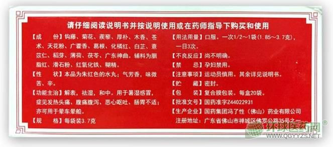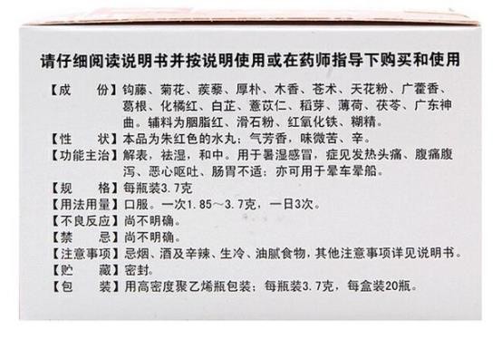 【成份】廣藿香、蒼術(shù)、厚樸、葛根、鉤藤、薄荷、白芷、神曲茶、茯苓、薏苡仁、木香、稻芽等16味。