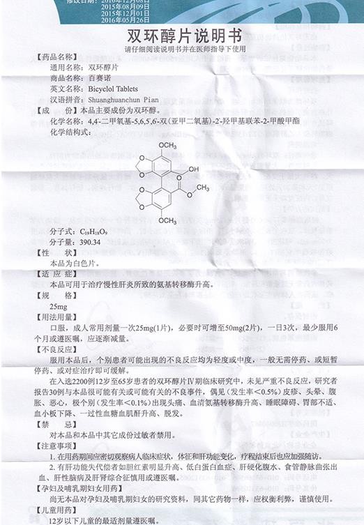 服用本藥后,個別患者可能出現的不良反應均為輕度或中度,一般無需停藥、或短暫停藥、或對癥治療即可緩解。在入選2200例12歲至65歲患者的雙環(huán)醇片Ⅳ期臨床研究中,未見嚴重不良反應,研究者報告30例與本品很可能有關或可能有關的不良事件,偶見(發(fā)生率0.5%)皮疹、頭暈、腹脹、惡心,極個別(發(fā)生率0.1%)出現頭痛、血清氨基轉移酶升高、睡眠障礙、胃部不適、血小板下降、一過性血糖血肌酐升高、脫發(fā)。