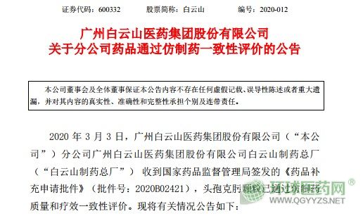 - 3月4日,廣州白云山發(fā)布公告稱:其分公司廣州白云山醫(yī)藥集團(tuán)股份有限公司白云山制藥總廠收到國(guó)家藥品監(jiān)督管理局簽發(fā)的《藥品補(bǔ)充申請(qǐng)批件