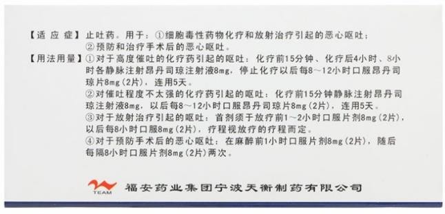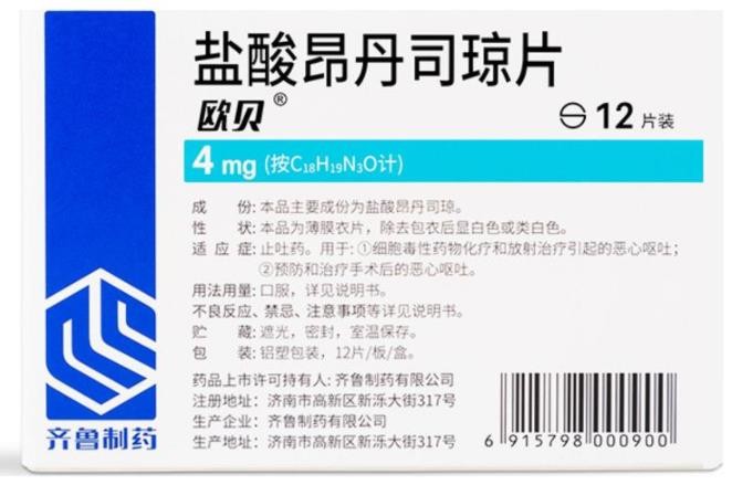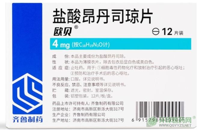 西藥、處方藥、非醫(yī)保。止吐藥。用于:1.細(xì)胞毒性藥物化療和放射治療引起的惡心嘔吐;2.預(yù)防和治療手術(shù)后的惡心嘔吐。齊魯制藥有限公司、福安藥業(yè)集團(tuán)寧波天衡制藥有限公司生產(chǎn)。【藥品名稱】通用名稱:鹽酸昂丹司瓊片