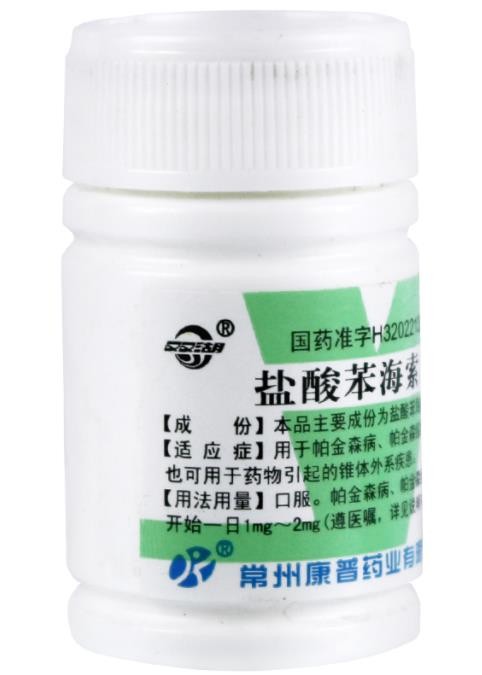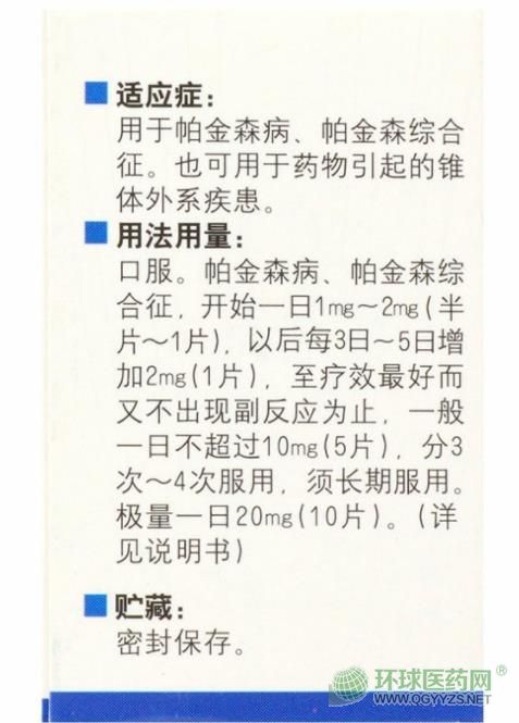 【用法用量】口服帕金森病、帕金森綜合征,開(kāi)始一日1~2mg(半片~1片),以后每3~5日增加2mg(1片),至療效最好而又不出現(xiàn)副反應(yīng)為止,一般一日不超過(guò)10mg(5片),分3~4次服用,須長(zhǎng)期服用。極量一日20mg(10片)。藥物誘發(fā)的錐體外系疾患,第一日2~4mg(1~2片),分2~3次服用,以后視需要及耐受情況逐漸增加至5~10mg(2.5~5片)。老年患者應(yīng)酌情減量。