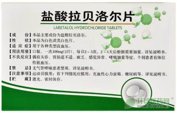 【成份】鹽酸拉貝洛爾,其化學名稱為:5-[1-羥基-2(1-甲基-3苯丙胺基)-乙基]水楊酰胺鹽酸鹽。分子式:C19H24N2O3?HCl分子量:364.87