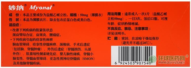- 本頁面信息僅供參考,請以產(chǎn)品實際附帶說明書為準。 鹽酸乙哌立松片 (妙納)外包裝 鹽酸乙哌立松片 (妙納)說明書圖片版(